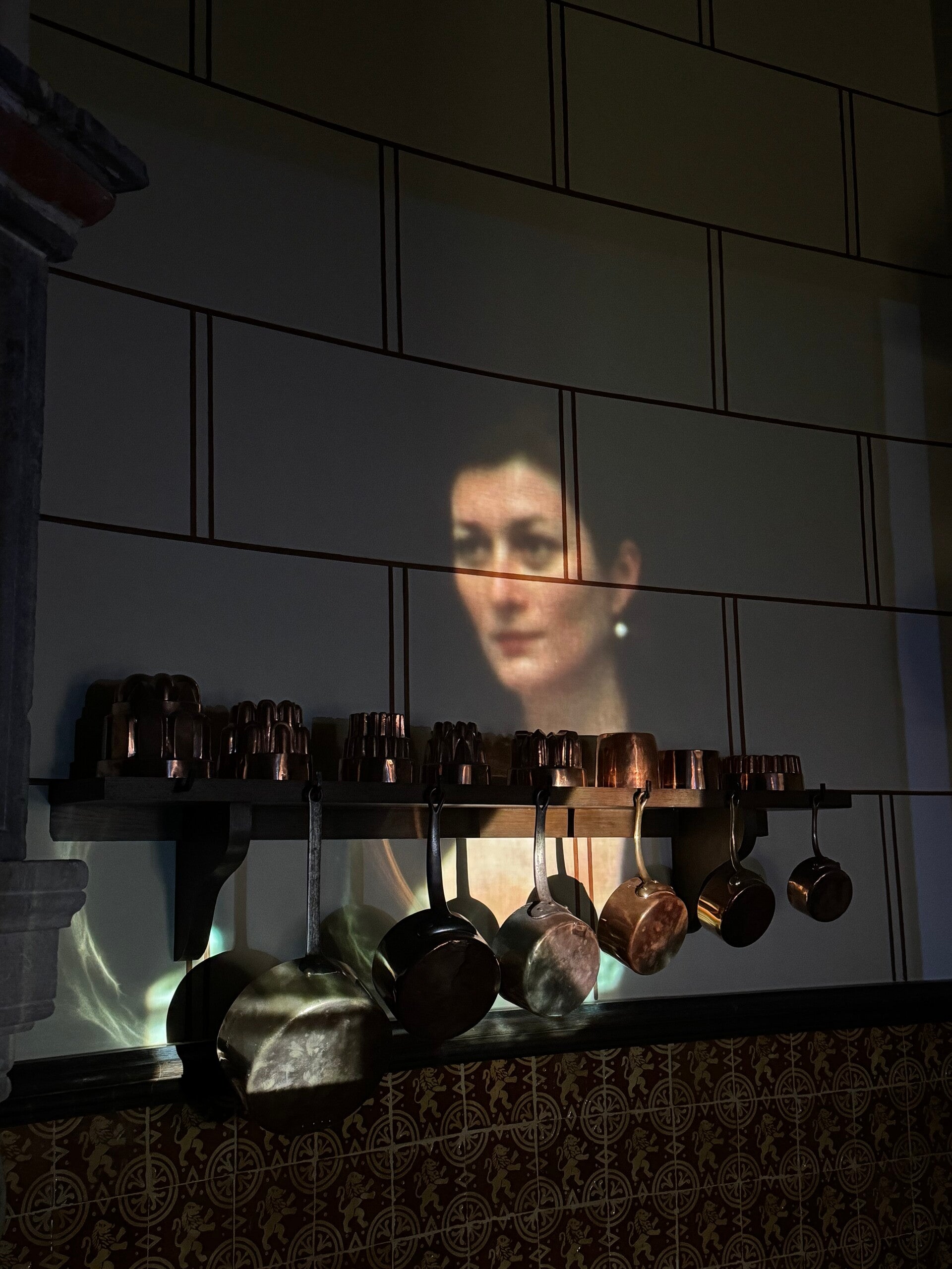 Video still van Long Goodbye (David Claerbout - 2007) op de keukenmuur van Kasteel Gaasbeek